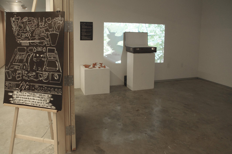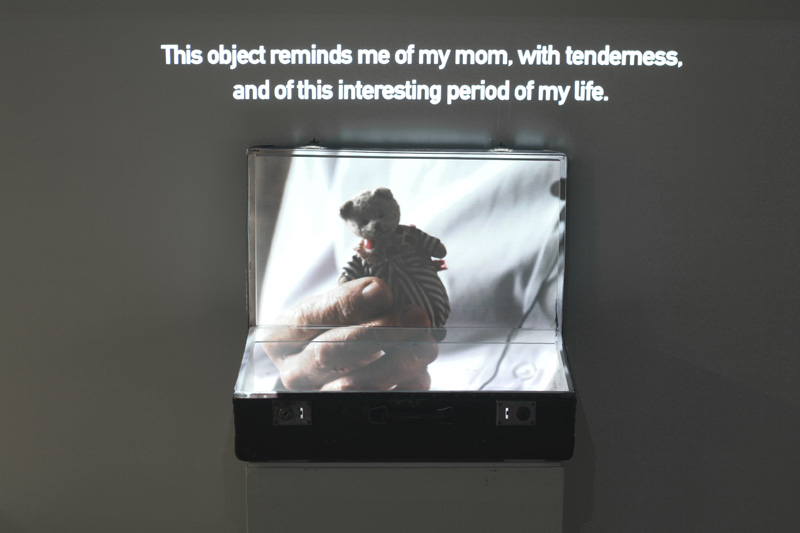 Finally, Still Life with a Suitcase is an interactive project, because each clay figurine was programmed to synchronize with the edited vignette related to the participant who contributed the original object. I set up the suitcase to digitally “read” these objects working together with a digital media specialist, Adam Siroky. Adam designed and programmed object-recognition hardware, placed inconspicuously inside the suitcase, which launched a corresponding vignette each time an object came within range of its sensor. This meant that when an audience member placed an object into the suitcase, a video corresponding to this object began playing on the screen, showing videos of research participants as they talked about and placed their objects inside the suitcase.